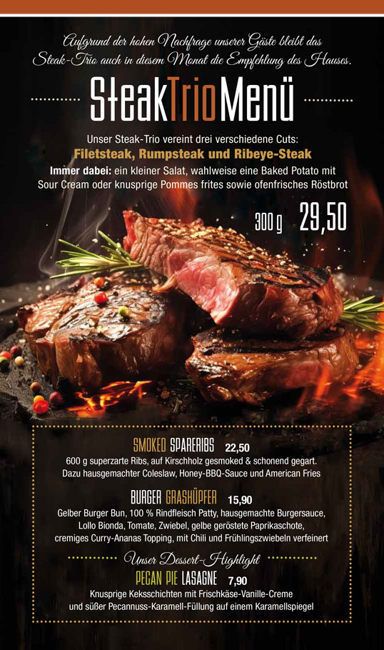 Drei Steak-Cuts (Filet, Rump und Ribeye) mit Salat, Baked Potatoe, Sour Cream oder Pommes sowie Röstbrot. Oder Sie genießen unsere Spareribs, auf Kirschholz gesmoked. Oder den Burger „Grashüpfer“ mit 100 % Rindfleisch, Burgersauce, Lollo Bionda, Tomate, geröstete gelbe Paprika, Curry-Ananas Topping, mit Chili und Frühlingszwiebeln.